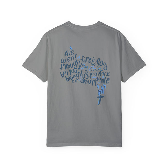 This garment-dyed Comfort Colors tee carries more than fabric—it carries a testimony. Inspired by the promise “You brought us through fire and flood,” this design honors both the refining flame and the overwhelming wave—and the God who leads us through them.